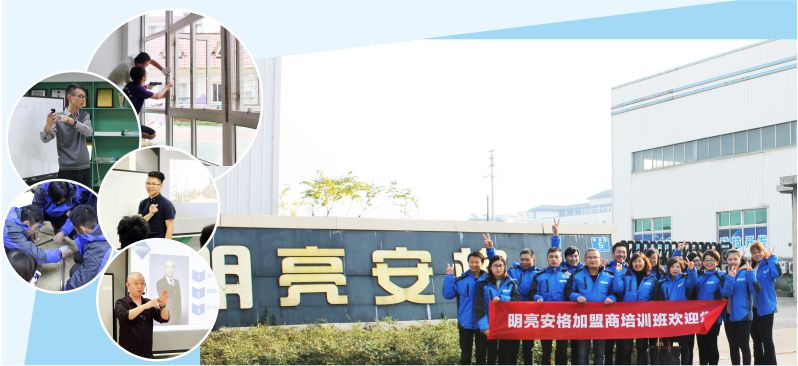 明亮安格開設培訓班,以成熟的培訓機制,特聘專業講師和優秀加盟商為加盟商開展企業文化、產品知識、測量安裝、銷售技巧、活動策劃、市場推廣、渠道拓展、公關禮儀等專題培訓。